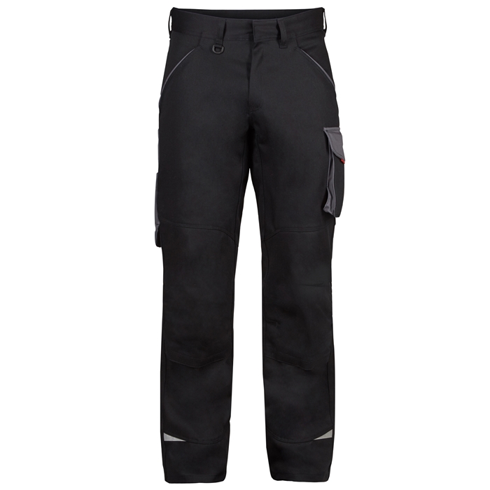 Funktionel arbejdsbuks med mange detaljer. Optimal pasform med bl. a. ergonomisk formet knæparti og panel i indersøm, der giver en behagelig skridtsøm. To rummelige skrålommer foran. Strop med D-ring til fæstning af f. eks. ID-kort foran. To rummelige bag