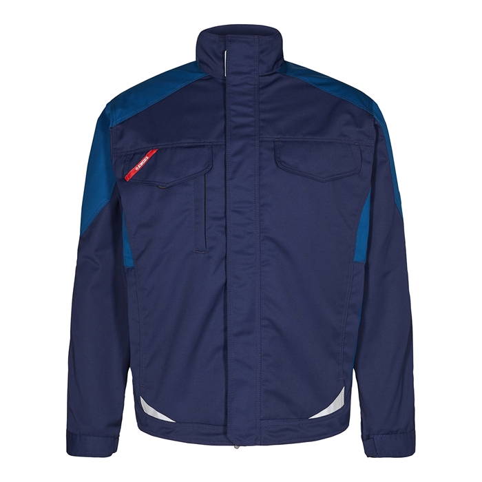 Funktionel arbejdsjakke med mange detaljer. Forlænget bagstykke med læg for øget bevægelighed. Panel over lynlås i front. To rummelige stiklommer. To brystlommer med klap den højre med strop med D-ring til fæstning af f. eks. ID-kort og med ekstra lynlås