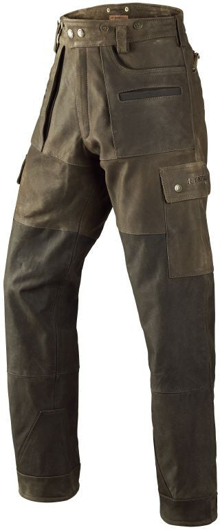 Hrkila Angus Skindbukser. Meget slidstærke bukser i ægte læder, hvor forlommerne er med paspolering og indvendig patronholder. Store praktiske lårlommer, baglommer med lynlås og snelås. Angus er produceret i 100 bøffel nubucklæder og er et naturprodu