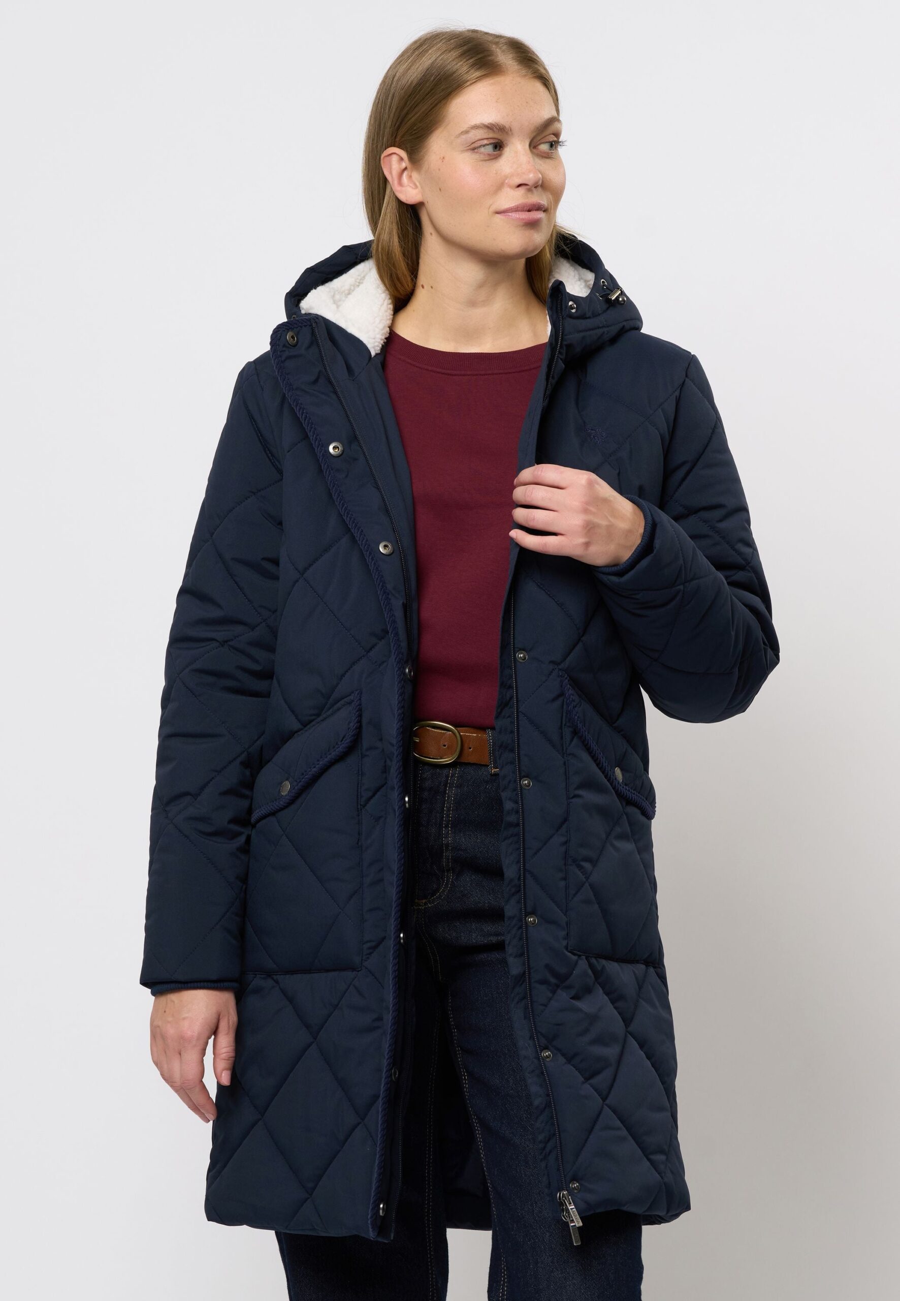 Karola er en lang, vatteret jakke med justerbar hætte og blødt foer, der giver ekstra varme og komfort på kolde dage. Det klassiske quiltede mønster skaber struktur, mens detaljer som tovejslynlås og praktiske lommer gør jakken perfekt til hverdagsbrug. E