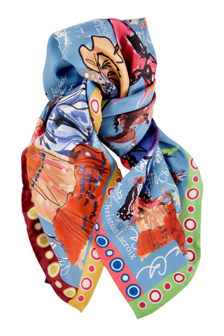 Smukt denim blåt silketørklæde i 100 silke twill fra det franske haute couture hus Christian Lacroix. De croquis tegnede mannequiner er udført i såvel elegante pasteller som varmere toner på jeans blå bund. Tørklædet har håndlavede kanter med border i gr