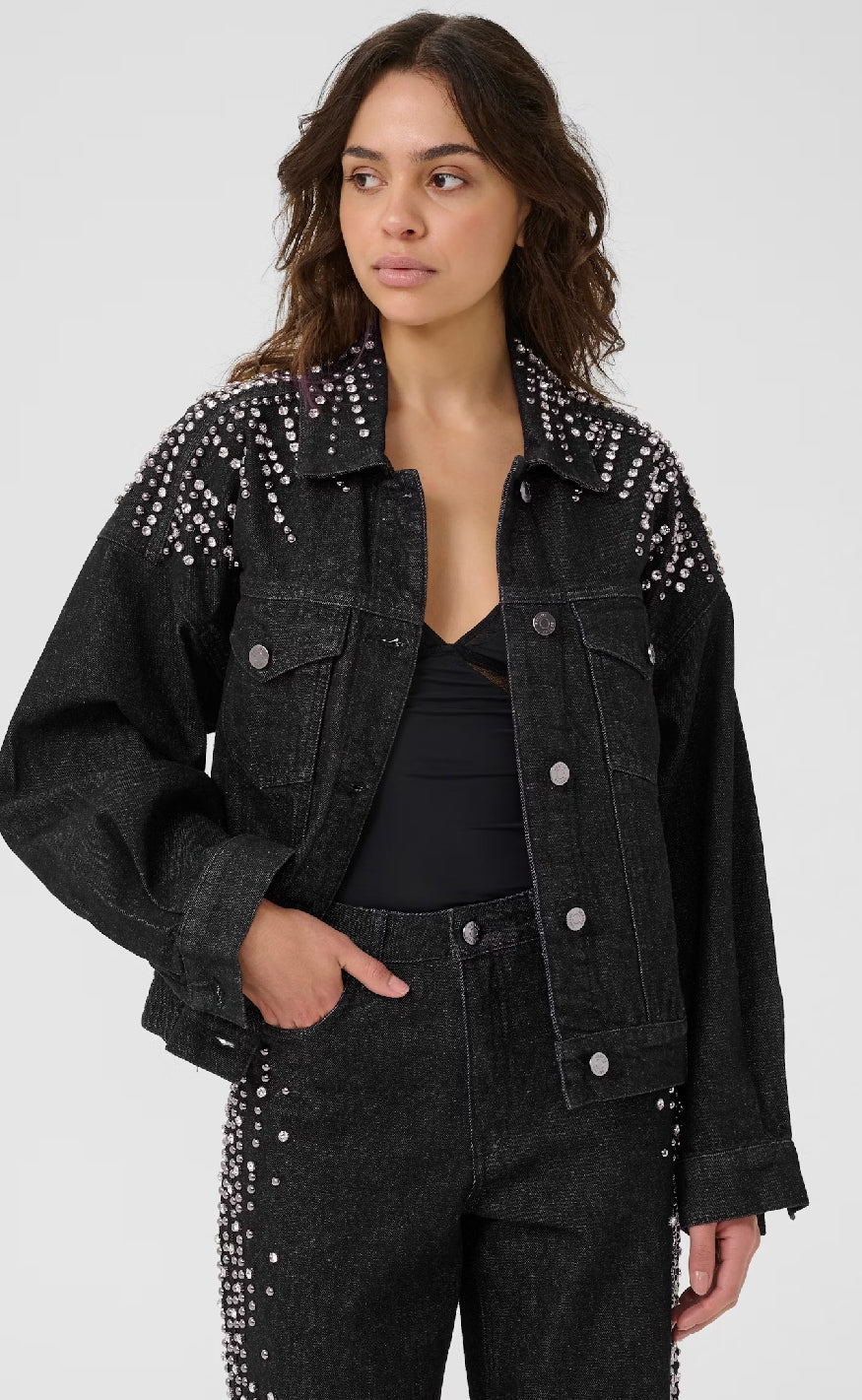 Jakke fra Gestuz Denimjakke fra Gestuz i lige pasform med klassisk krave. Dekoreret med rhinsten på skuldre og krave, der giver et cool og iøjnefaldende statement-look.