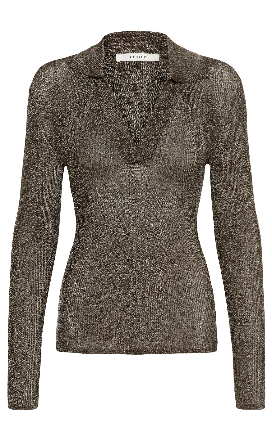 Bluse fra Gestuz Langærmet top i metallisk strik med dyb V-udskæring og krave – et elegant og festligt design fra Gestuz.