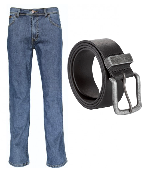 Wrangler jeans med stræk og læder bælte. Model:Texas Stretch. Farve: Stonewash. Kvalitet: Bukser 98,5 bomuld – 1,5 elastan. Bælte 100 læder. Leveringstid:1-5 hverdage. Vælg blot bukse størrelse – vi finder det bælte der passer i størrelsen dertil.